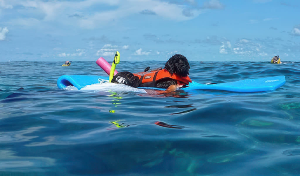 Etwas ganz Neues habe ich in Bezug auf Hundemitnahme gesehen. Hunde sind hier in den USA i.A. sehr beliebt, dürfen aber in Nationalparks, Amusementparks und auf Stränden nicht sein. Das Korallenriff ist ein National Sanctuary, aber da es unter Wasser ist, scheint es kein Hundeverbot zu geben. Wie sollten die Hunde auch dorthin kommen? Zwei Leute haben da eine Idee dazu. Scheinbar mag ihr Hund auch nicht so gerne alleine im Boot bleiben. Also nehmen sie ihn einfach zum Schnorcheln mit. Der Hund sieht unserem Charlie ähnlich, der hätte das sicher auch mitgemacht:
