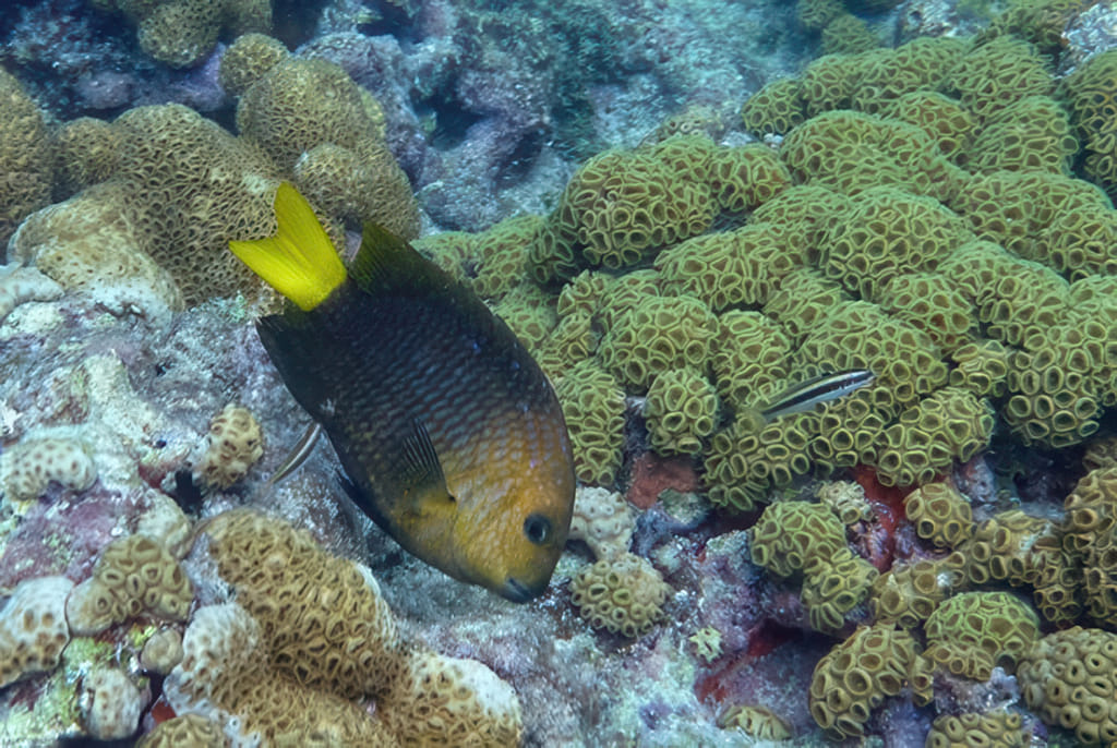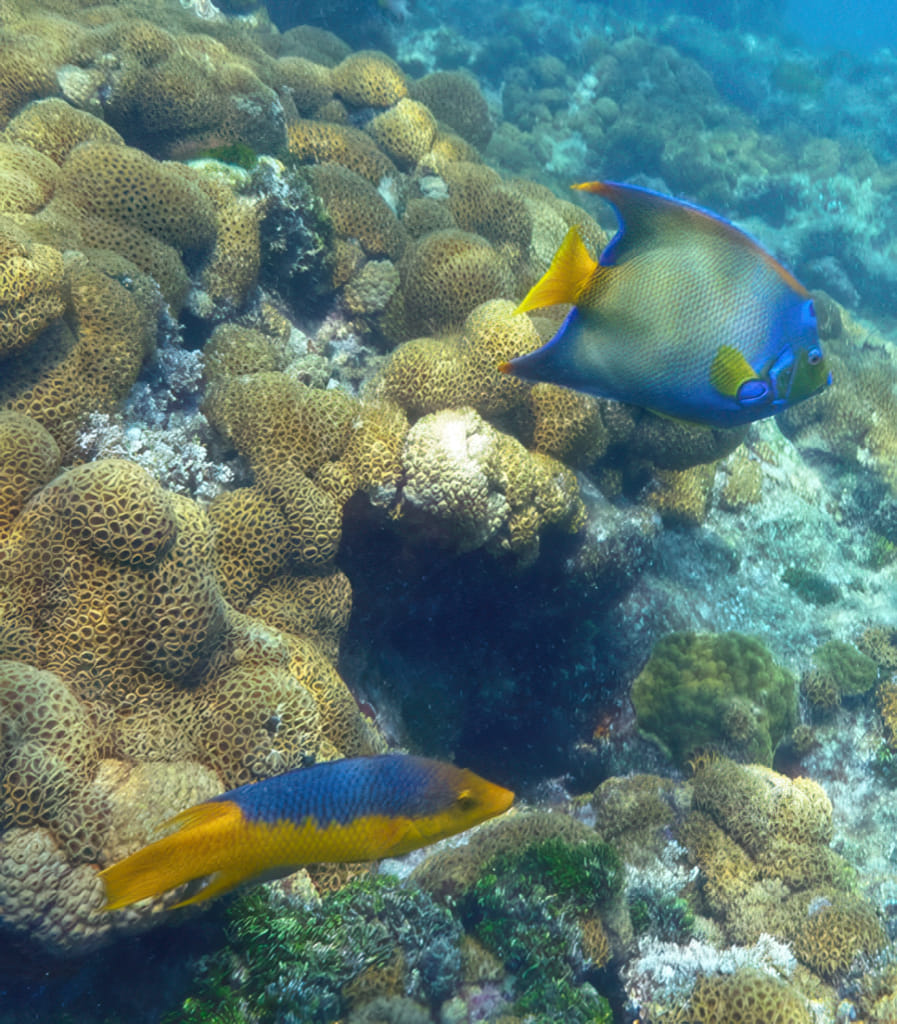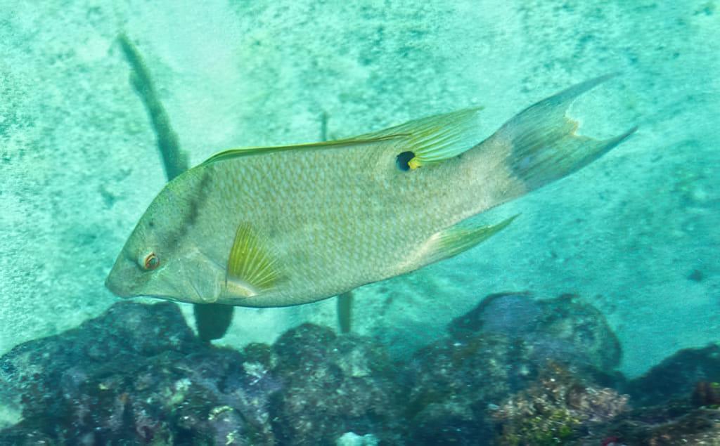 Und dann das seltenste Foto der drei Schnorcheltrips: Ein grau/oranger Fisch und der zwar gut sichtbare aber unfotographierbare bunte Riesenflachfisch auf einem Foto!