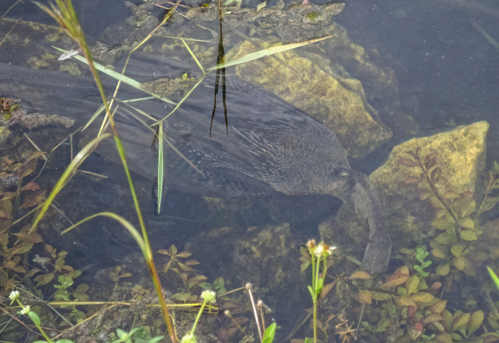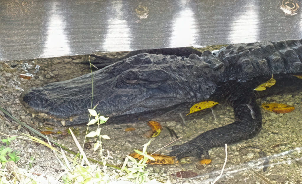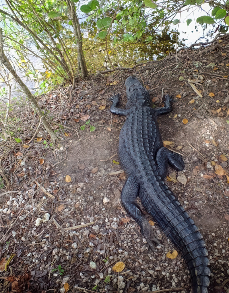 Die Alligatoren haben sich bei der Wärme nicht zum Sonnen rausgelegt, zwei habe ich im Schatten beim Chillen entdeckt. Der erste liegt dabei UNTER DEM STEG, da sucht man nicht gleich: