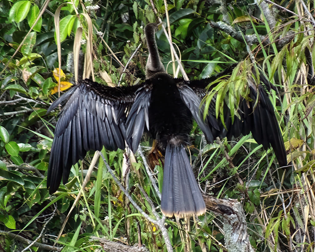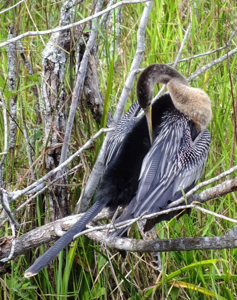 Nur zur Erinnerung: Anhingas sind die Vögel, die lange unter Wasser herumtauchen und dann ihr NICHT GEFETTETES Gefieder trocknen müssen. Hier ein Trockner: