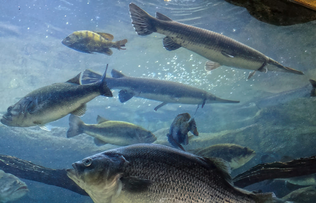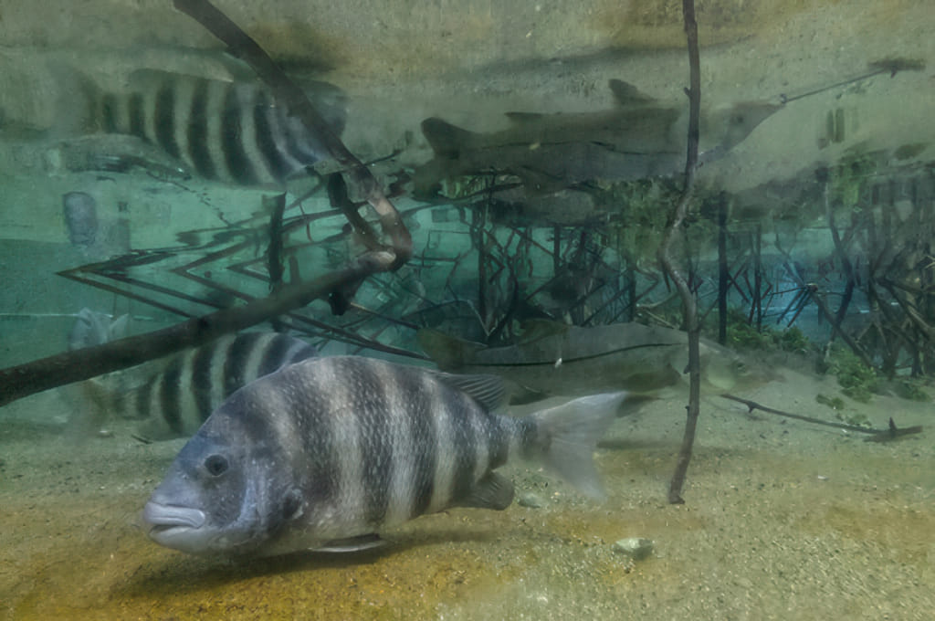 In sehr gut nachgebauten Mangroven sieht man Fische und Krebse: