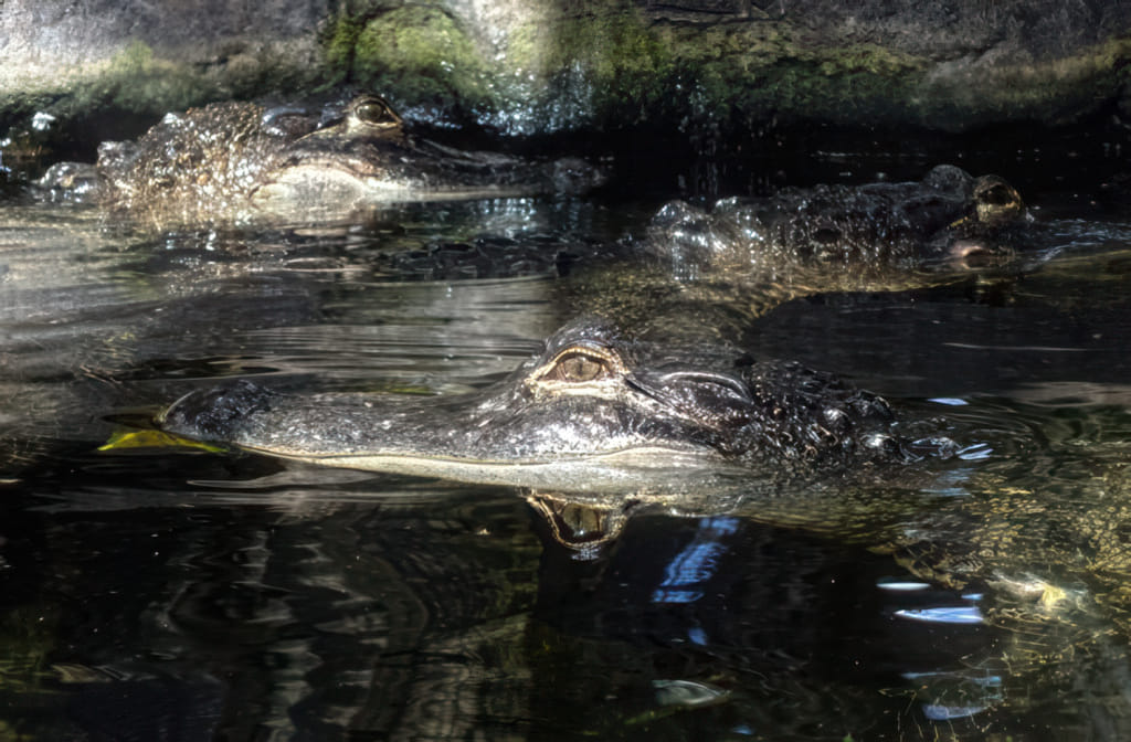 Alligatoren dürfen natürlich auch nicht fehlen. Die sind zwar komplett hinter Glas, dafür kann man sie hautnah beobachten. Sie treiben (ober und unter Wasser an einer Glasscheibe zu sehen) nur 1cm vom Kopf/Auge entfernt im Wasser: