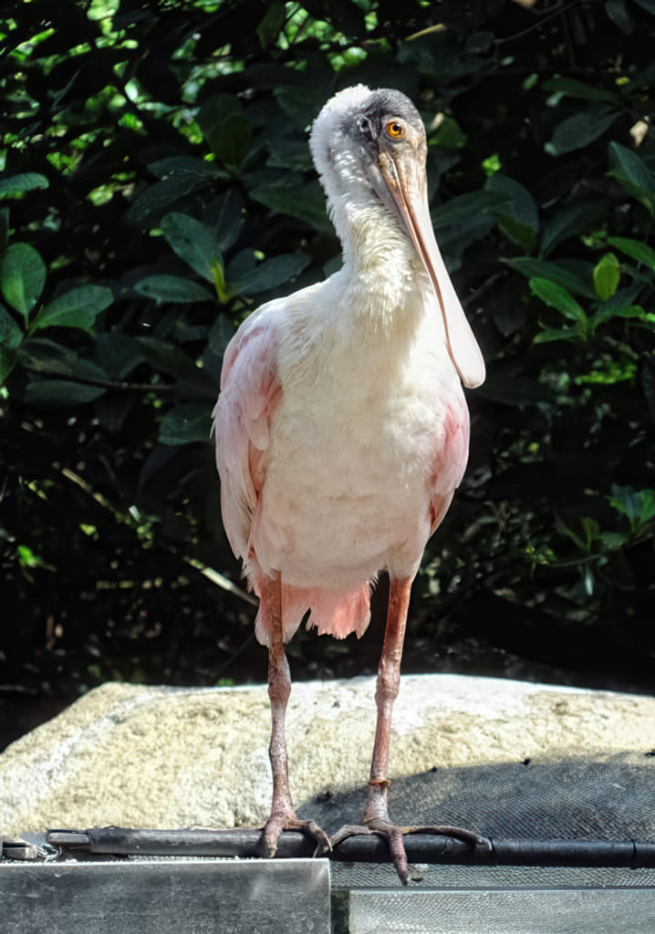 Auf den Becken sitzt völlig frei ein Spoonbill. Dem habe ich auf die Kralle getapscht und es war ihm gar herzlich wurscht. Ist dann auch gleich an Ort und Stelle eingepennt: