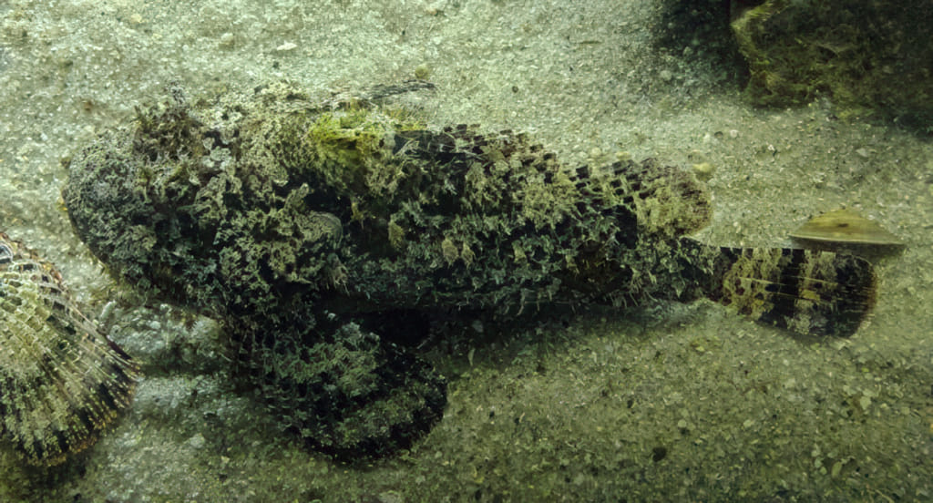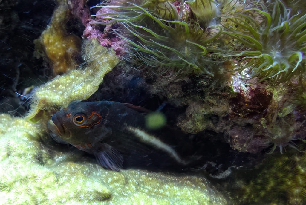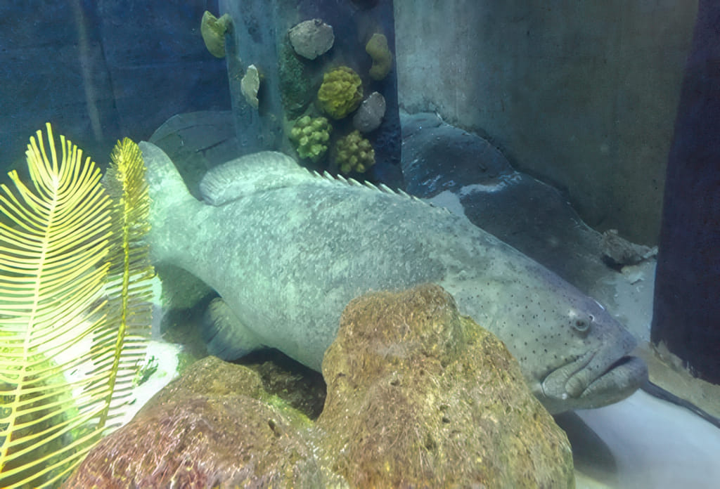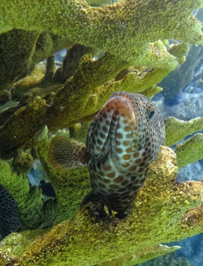 Im Bereich des tieferen Meeres wird es erwartungsgemäß schwieriger Fotos zu machen; so hell ist es dort nun nicht. Dieser Riesengrundler hat aber still genug gehalten: