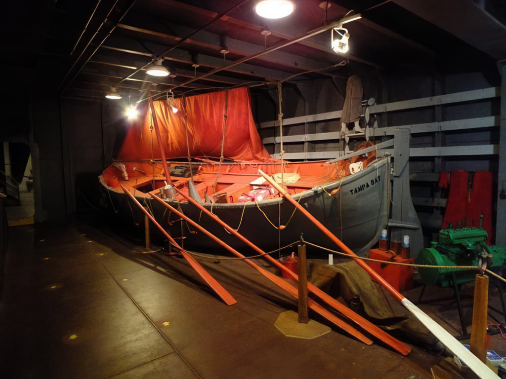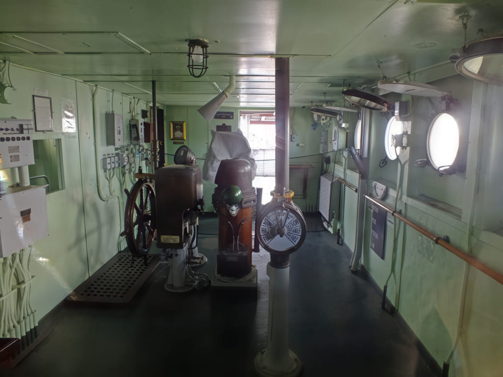 Ich muß gleich vorwegnehmen, daß das der enttäuschende Teil des Tages war. Das Ding fährt zwar noch 2x im Jahr herum (um die Fahrtauglichkeit zu beweisen), ist aber kein wirkliches Kriegsschiff mit besonderer Geschichte. Es ist im Prinzip ein stinknormales Frachtschiff, das ein paar Kanonen hatte (jetzt sind es nicht mehr so gar arg viele) um sich im Fall der Fälle verteidigen zu können. Dem entsprechend wenig ist auf der Tour zu sehen. Im Innenraum fängt alles mit den Rettungseinrichtungen an: