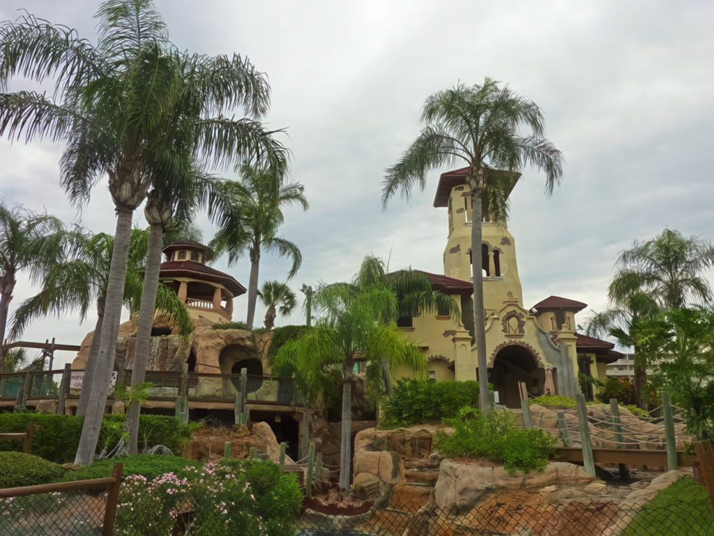 Fangen wir mit der Dekoration an: Es gibt wieder viel Wasser, ein schiff und lebende Alligatoren. Auch spanisch aussehende Gebäude sind zu finden: