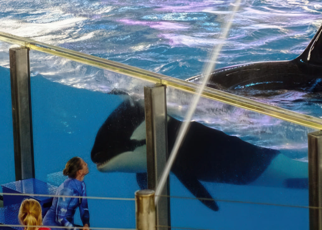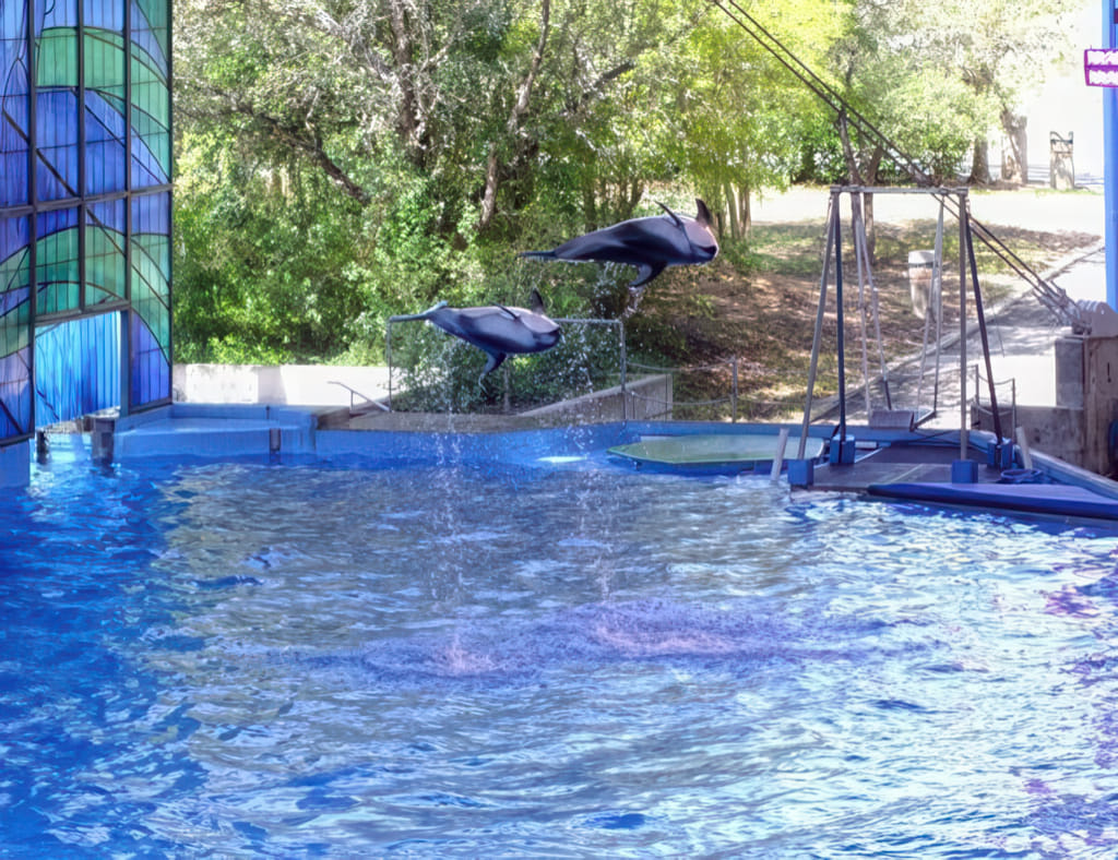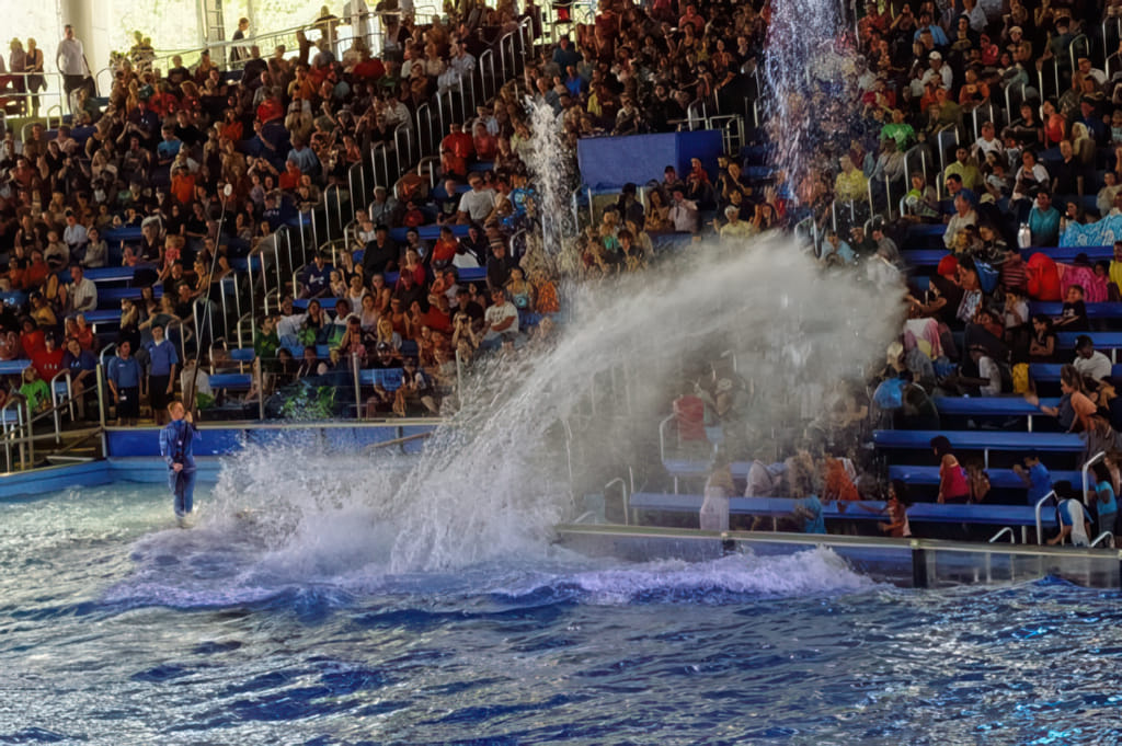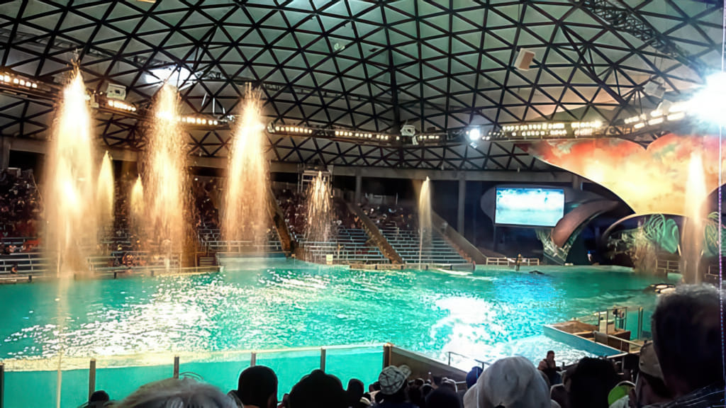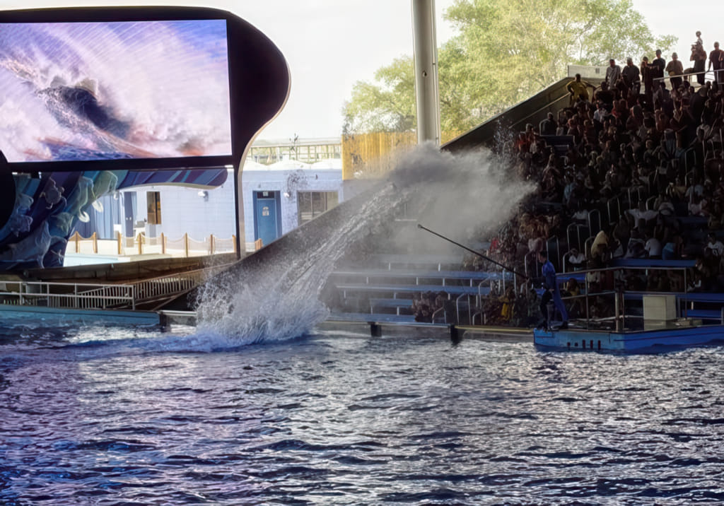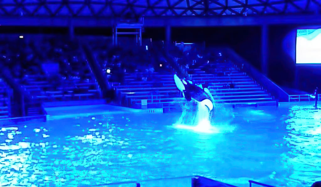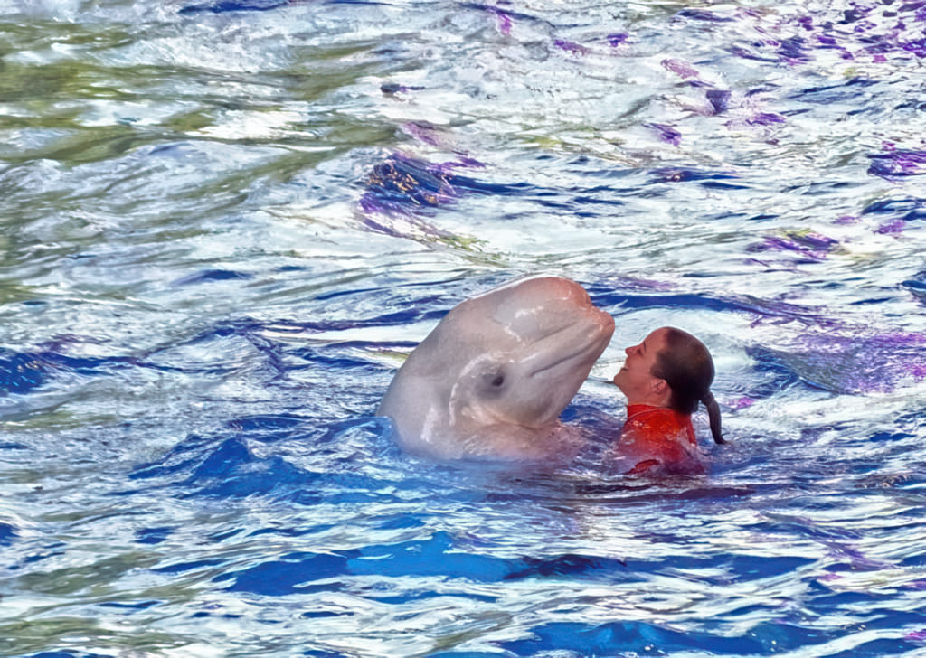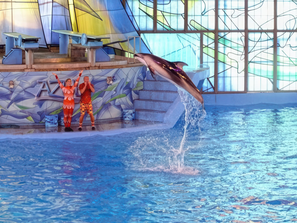 Bei den Tieren kommen Delphine und Belugawale vor (da dürfen die Trainer auch mitschwimmen) und Papageien fliegen frei.