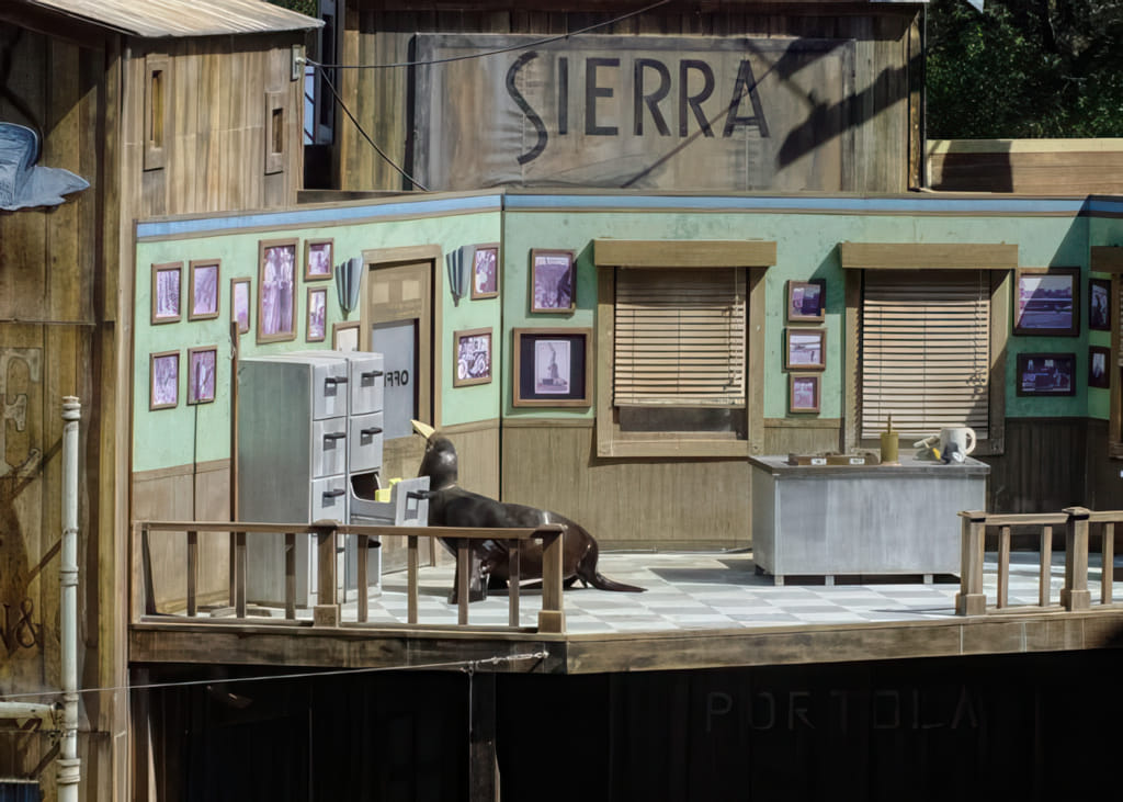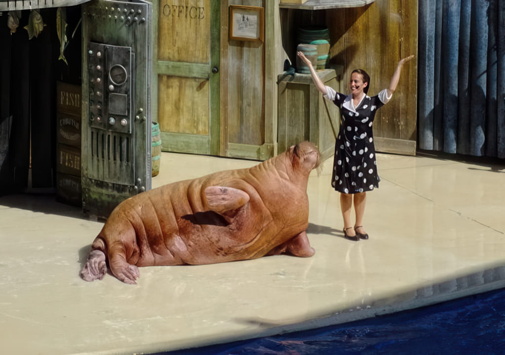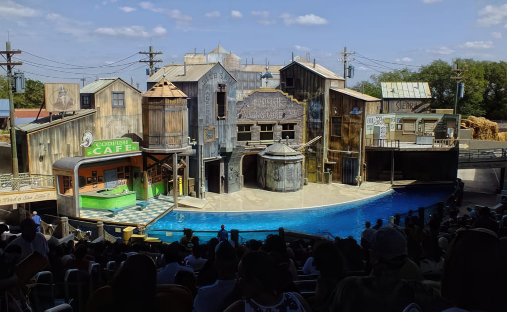 Die dritte große Tiershow ist die übliche Seelöwenshow. Hier spielt das in einer recht aufwendigen Fischfabrikkulisse: