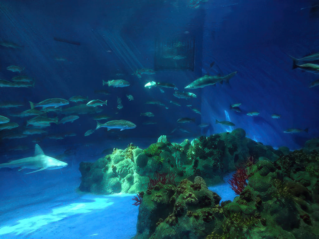 Wie gesagt versteckt aber doch finden sich Aquarien (irgendwann einmal war das das Hauptthema). Vom tropischen Fisch bis zum Golf mit Haien ist viel zu sehen: