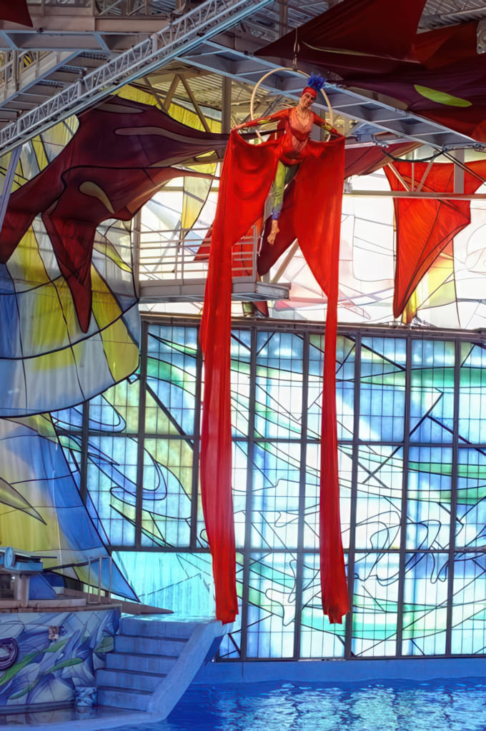 Bei den Artisten gibt es Turmspringer (auch von ganz oben aus dem Dach heraus), Wasserballett, Sprünge von Schaukeln und Sprungbrettern sowie Gummischnur- und Tuchakrobatik: