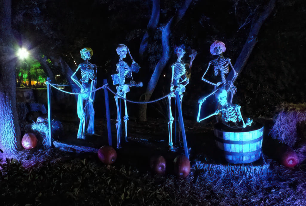 Wenn es dunkel wird, ist Gruselzeit. Ein großer Teil des Parks ist mit speziellen Halloweenattraktionen zugepflastert worden, wo einem mit Nebel, Puppen, Blitzen und natürlich Schreien Angst eingejagt werden soll. Wieder etwas, worauf ich verzichten kann (wenn man dafür auch noch mindestens eine Stunde Schlange stehen soll). Die Dekorationen sehen aber ganz ok aus: