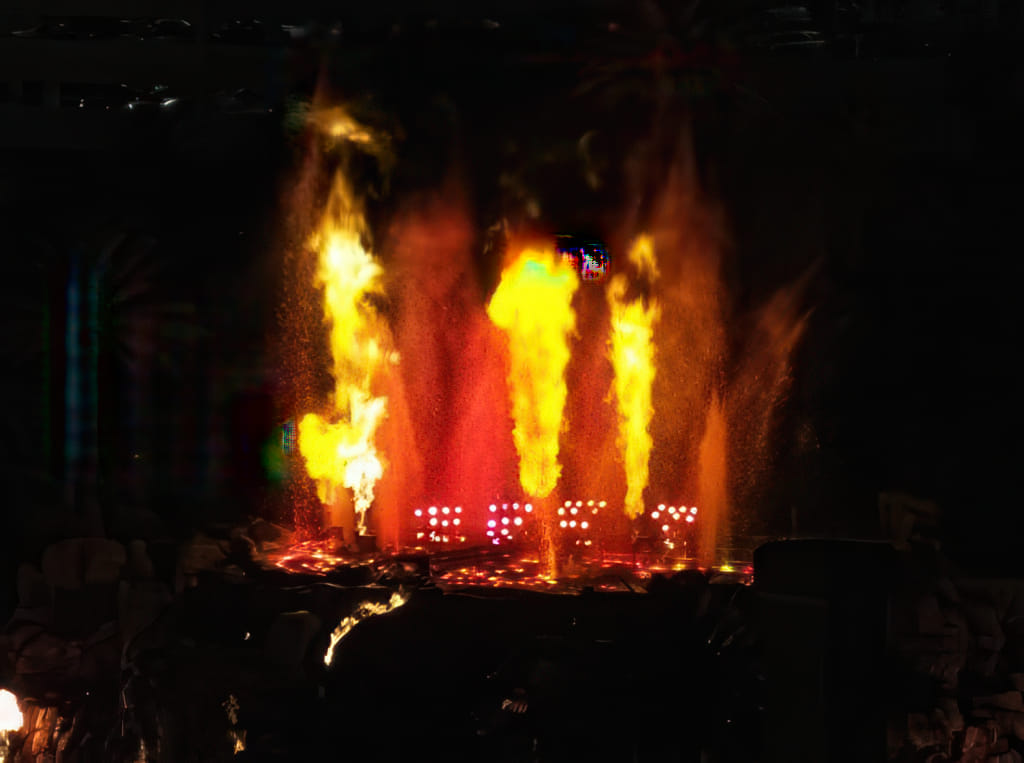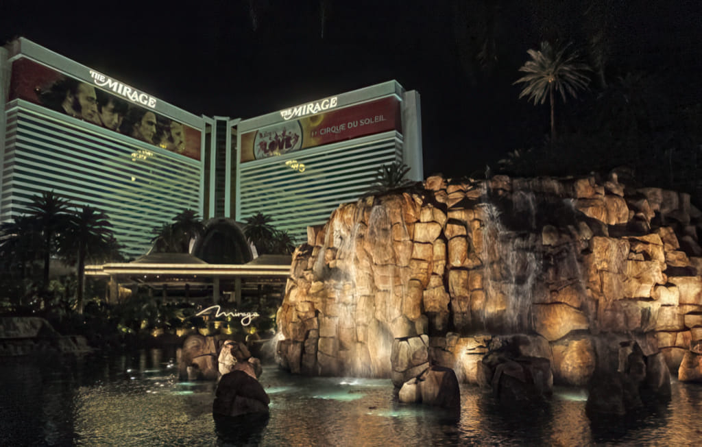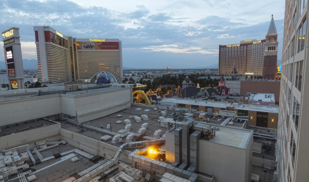 Die Aussicht ist nicht ganz ‘auf den strip’ aber fast. Zumindest sieht man die anderen Strip-Hotels und den explodierenden Vulkan: