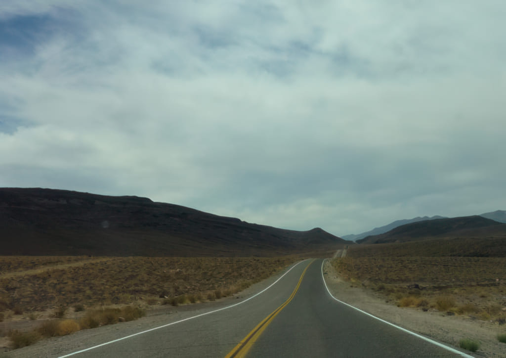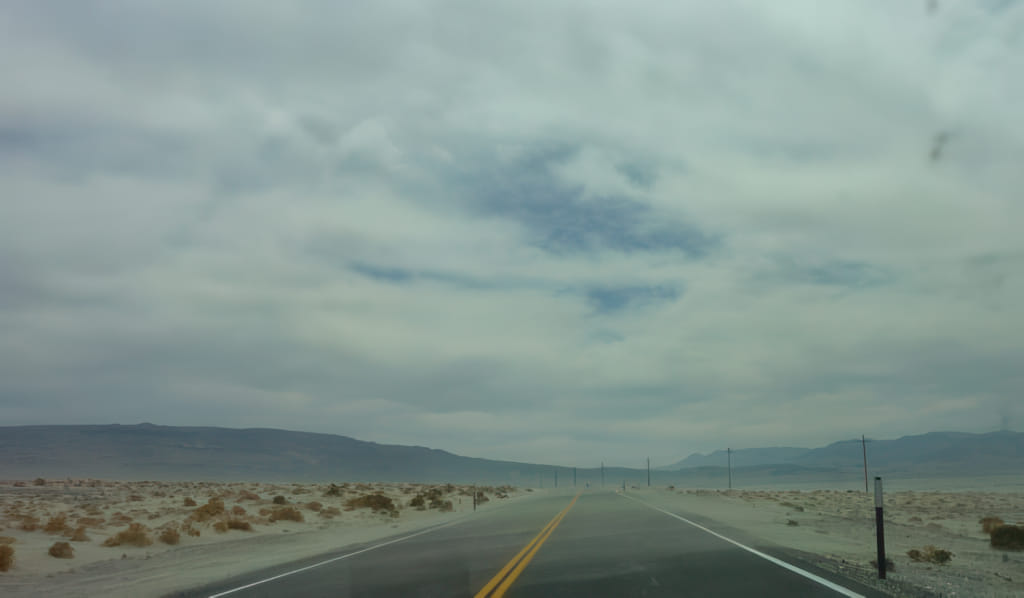 Scheinbar bin ich als Regengott gar nicht so übel. Ich hatte Regen in Petra und jetzt Regen im Death Valley. Aber zunächst alles der Reihe nach. Wir sind aus dem Motel losgefahren und ich hatte Hunger. Nicht so ganz unlogisch, denn in dem Motel gibt es zum Normaltarif von $150 die Nacht (nein, das habe ich nicht bezahlt) kein Frühstück. Wir haben auf die nächste Raststation gewartet und siehe da, schon bald war eine gefunden. Das Wetter sah zumindest schon recht brauchbar aus: