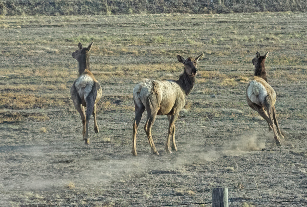 Bei der Abfahrt sind wir sehr schnell drauf gekommen, daß die Gegend am Abend nicht so ganz unbevölkert ist: Überall Rehe und Hirsche. Der hier stand mitten auf der Straße und war recht unbekümmert: