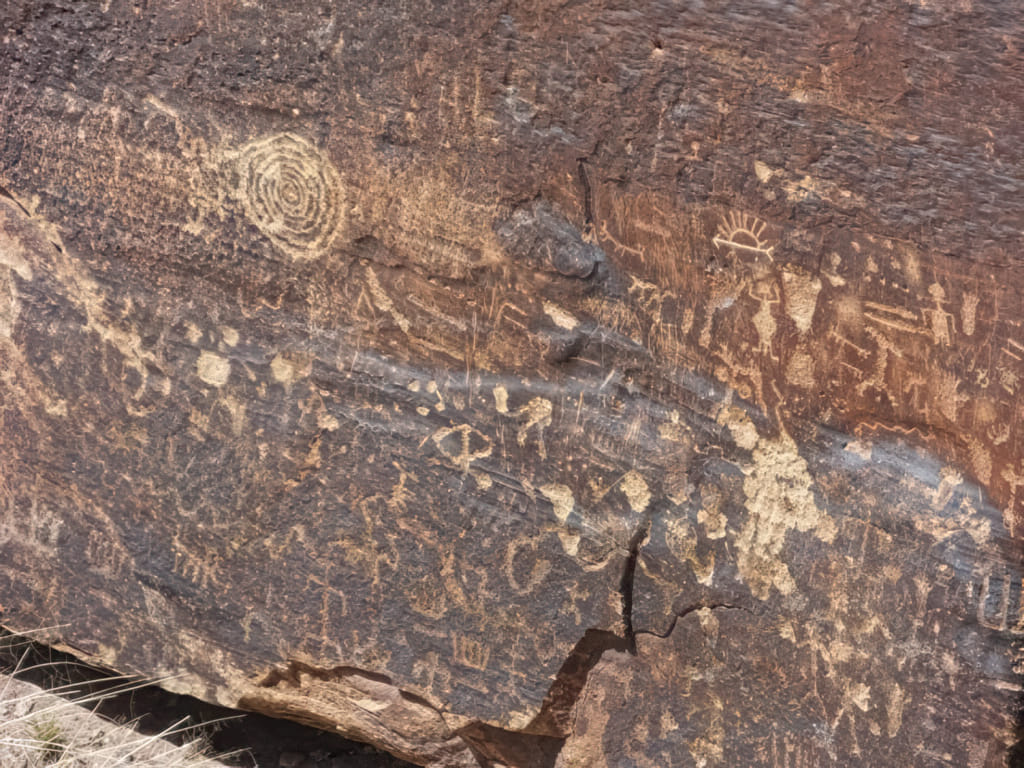 Der nächste Stopp geht zu einem Felsen, der frühe Graffiti zeigt: