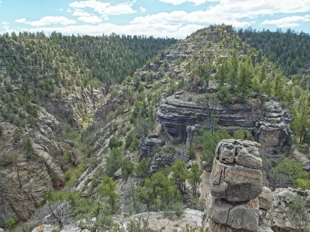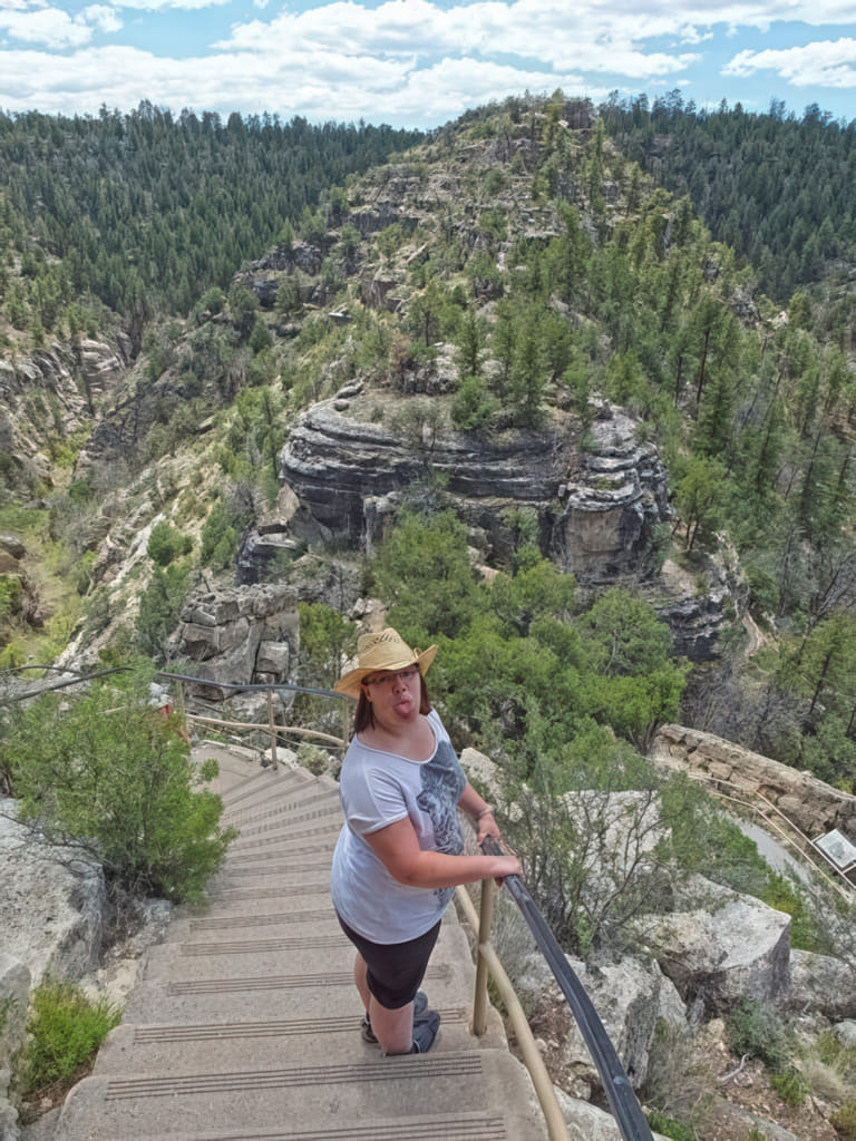 Der Walnut Canyon war seeeehr lange Zeit von Ureinwohnern bewohnt und scheint eine nette Wohngegend zu sein. Das liegt vorwiegend daran, daß härtere Gesteinsschichten auf weicheren lagern und so automatisch große Felsüberhänge entstehen, die man als Wohnhöhle verwenden kann. Der Besucher kommt am oberen Rand des Canyons an und muß 240 Stufen hinunter steigen, um zum Besichtigungsfelsen zu kommen: