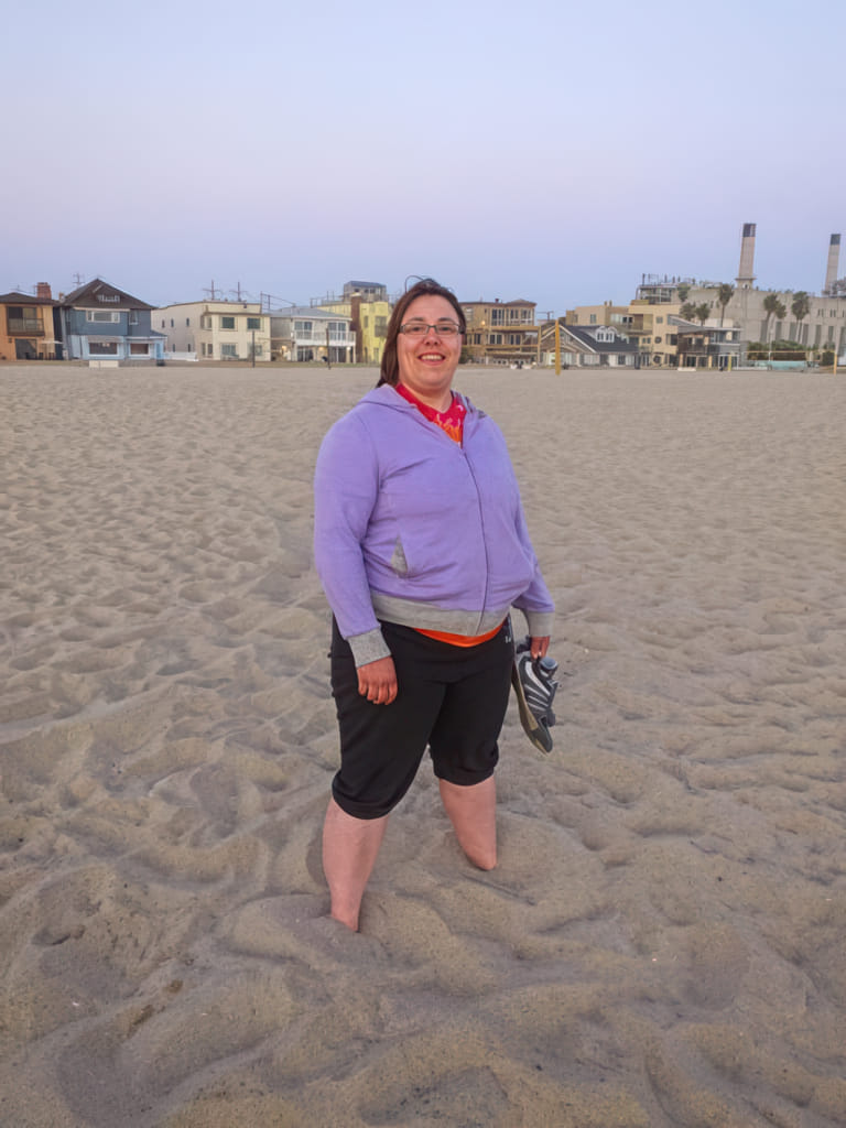 Wenn die Sonne um die Jahreszeit weg ist, wird es sehr schnell frisch. Daher ist Astrid mit Jacke rumgelaufen. Der Sand war oberflächlich auch schon kalt, aber wenn man die Zehen hineinbohrt ist es noch angenehm warm: