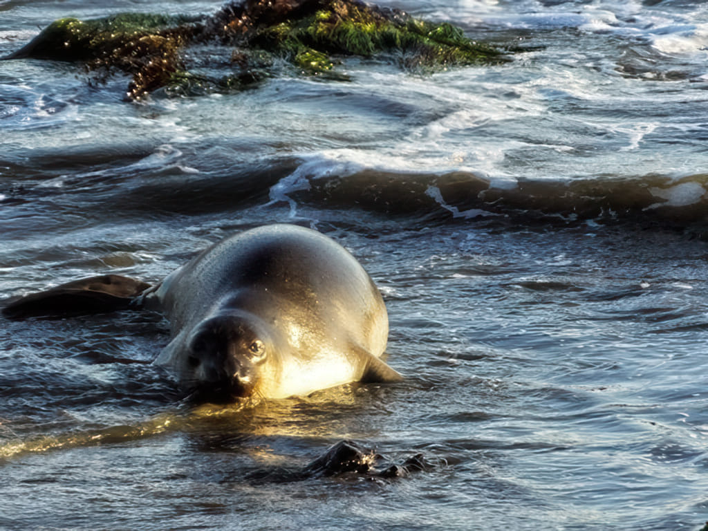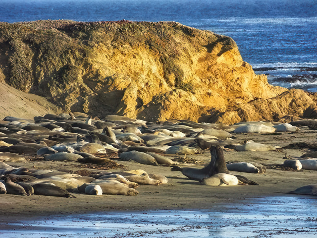 Wer hätte übrigens gedacht, daß die Schließung der National Dinge auch ein Nächtigungsproblem hervorrufen. Ein großer Abschnitt der Küste ist ein National Forrest und wie das dumme Wort National nahelegt, auch da sind alle Campingplätze geschlossen. Wir sind daher deutlich länger gefahren als geplant, denn alle Campingplätze waren geschlossen. Die Seeelephanten haben wir daher schon bei sehr niedriger Sonne gesehen:
