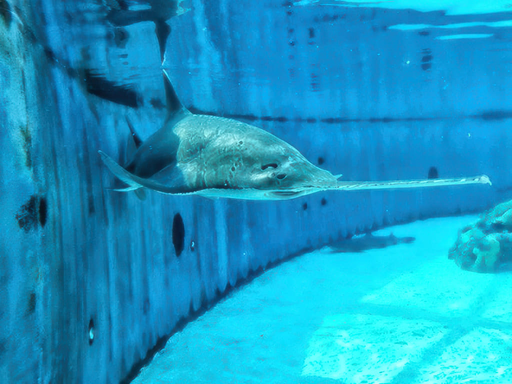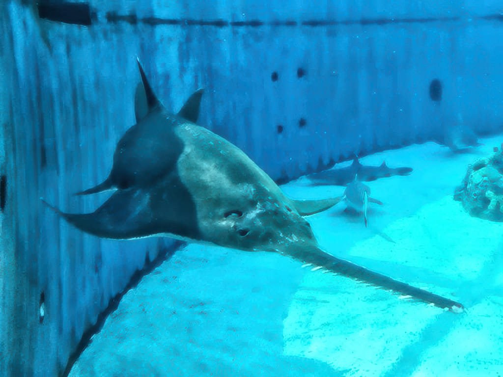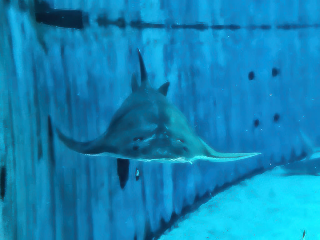 Das größere Haibecken von unten hat sehr beeindruckende Ausblicke zu bieten. Der Sägefisch sieht ziemlich bedrohlich aus. Nur wer weiß, daß es sich dabei eigentlich um einen Rochen handelt? Die Säge hat der gute übrigens nicht zur Zierde: er schwimmt damit in Fischschwärme und fetzt damit umher. Irgendwen wird er schon erwischen, den er dann fressen kann: