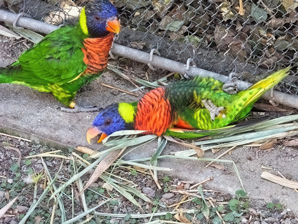 Im fast schon zur Grundausstattung eines Zoos gehörenden Lorekeet Gehege kann man die Loris mit Nektar (vorher zu kaufen) füttern. Die in dem Aquarium waren ziemlich satt und die armen Käufer mußten sich anstrengen, Ihre Becher loszuwerden. Der Lori ist übrigens nicht krank oder so, er hat sich zum Spielen auf den Rücken geworfen. Fühlte sich wohl ziemlich sicher: