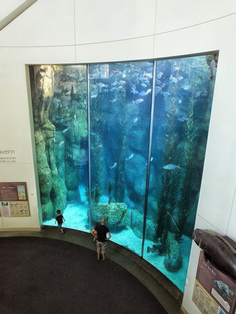 Ein Becken geht über beide Stockwerke und wir kamen gerade vorbei, wie zwei Taucher darin rumgedümpelt sind. Ob das spannend ist Kindern zuzuwinken? Ich habe für das Foto darauf gewartet, daß sie sich wieder verziehen, sonst hätte ich nur viele Hinterteile fotographieren können.