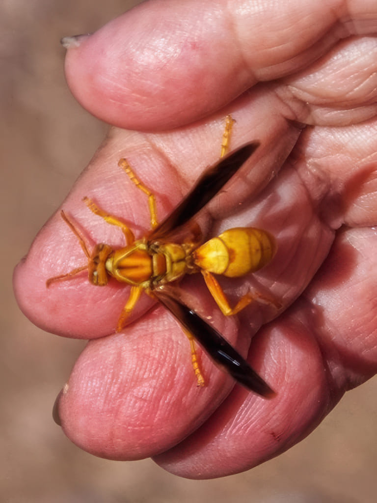Beim Wegräumen sind uns noch einige überdimensioniere Wespen nachgeflogen. Sie haben sich auch auf uns gesetzt.