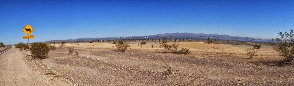 Was gibt es in der Wüste im Überfluß? Genau, Sonne. Und daher haben sie dort ein Photovoltaik Kraftwerk hingebaut. Solarzellen so weit das Auge blicken kann. Da konnte ich ohne Probleme Fotos machen.