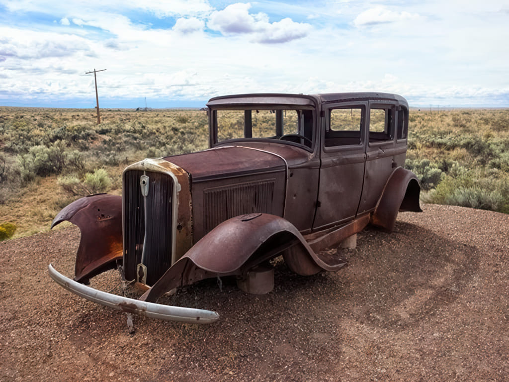 Gleich bei der Brücke über die Interstate, haben sie jetzt einen Oldtimer hingestellt, um auf die route 66 aufmerksam zu machen. Der Zustand des Oldtimers ist eindeutig mit der route 66 zu vergleichen. Leider.