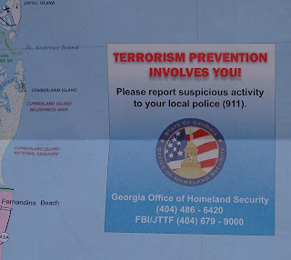 Schon im Museum of Aviation ist mir aufgefallen, daß an den Türen Zettel klebten, auf denen hingeweisen wurde, daß erhöhte Wachsamkeit wegen Terrorgefahr von Nöten sei und man daher alle ’seltsamen Vorkommnisse‘ melden solle. Da dachte ich noch an einen Spleen der doch alten Kriegsveteranen. Auf einem Campingplatz in Georgia wurde mir jedoch eine gratis Touristenkarte von Georgia überreicht. Und was sehe ich da als Aufdruck an der rechten unteren Seite: Und so eine Vernaderei soll wirklich was bringen?!?